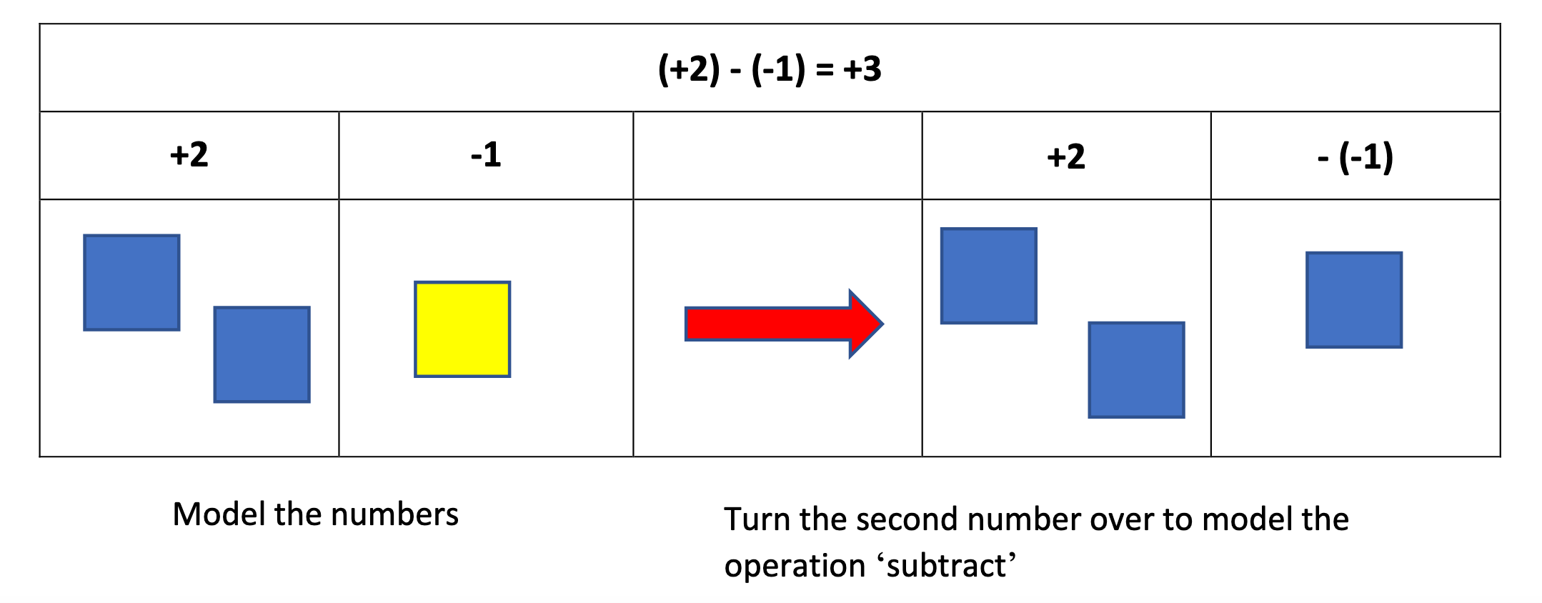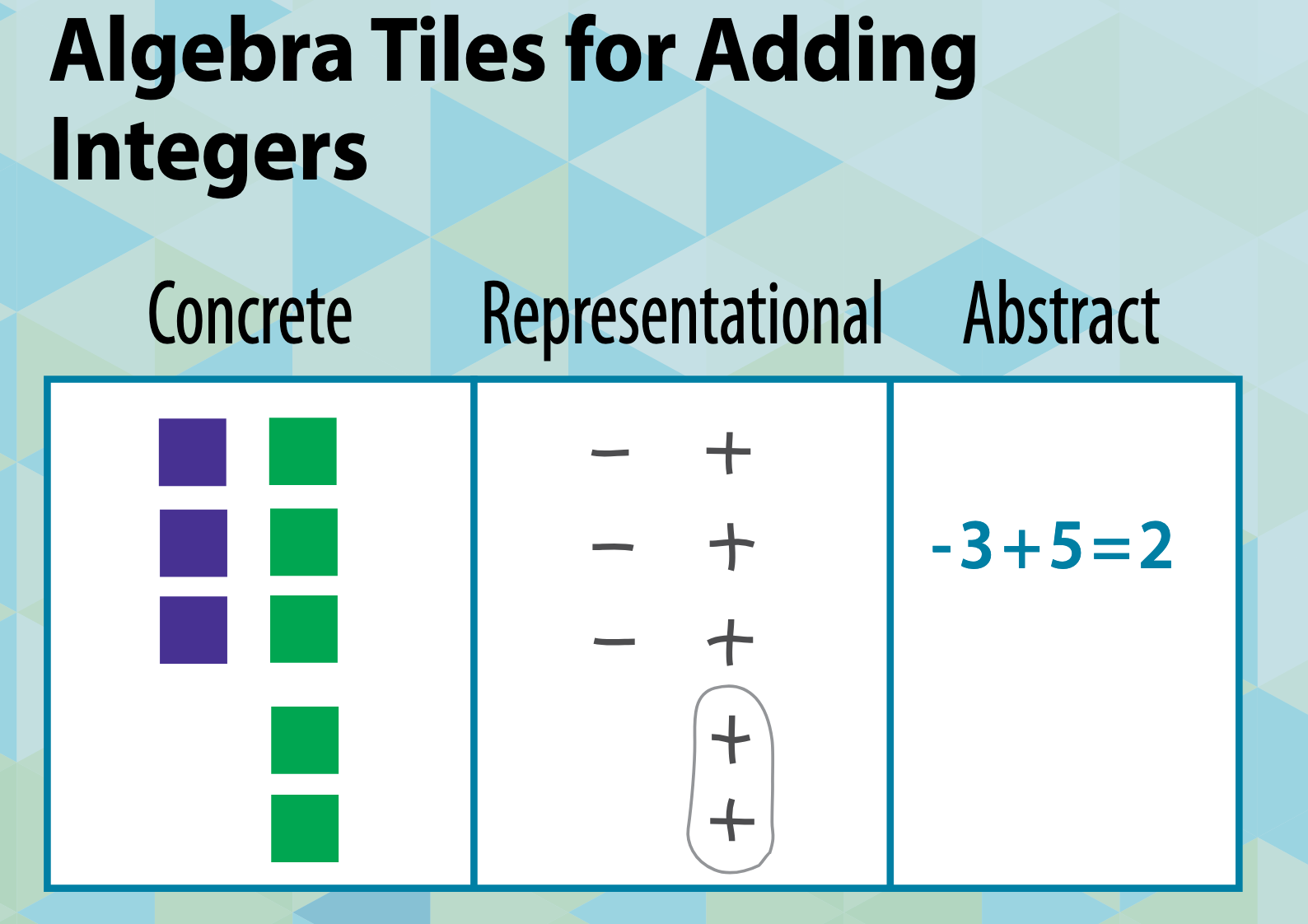 Depending on the grade of instruction, algebra tiles can be used as a concrete way to express various operations, such as the sum and difference.